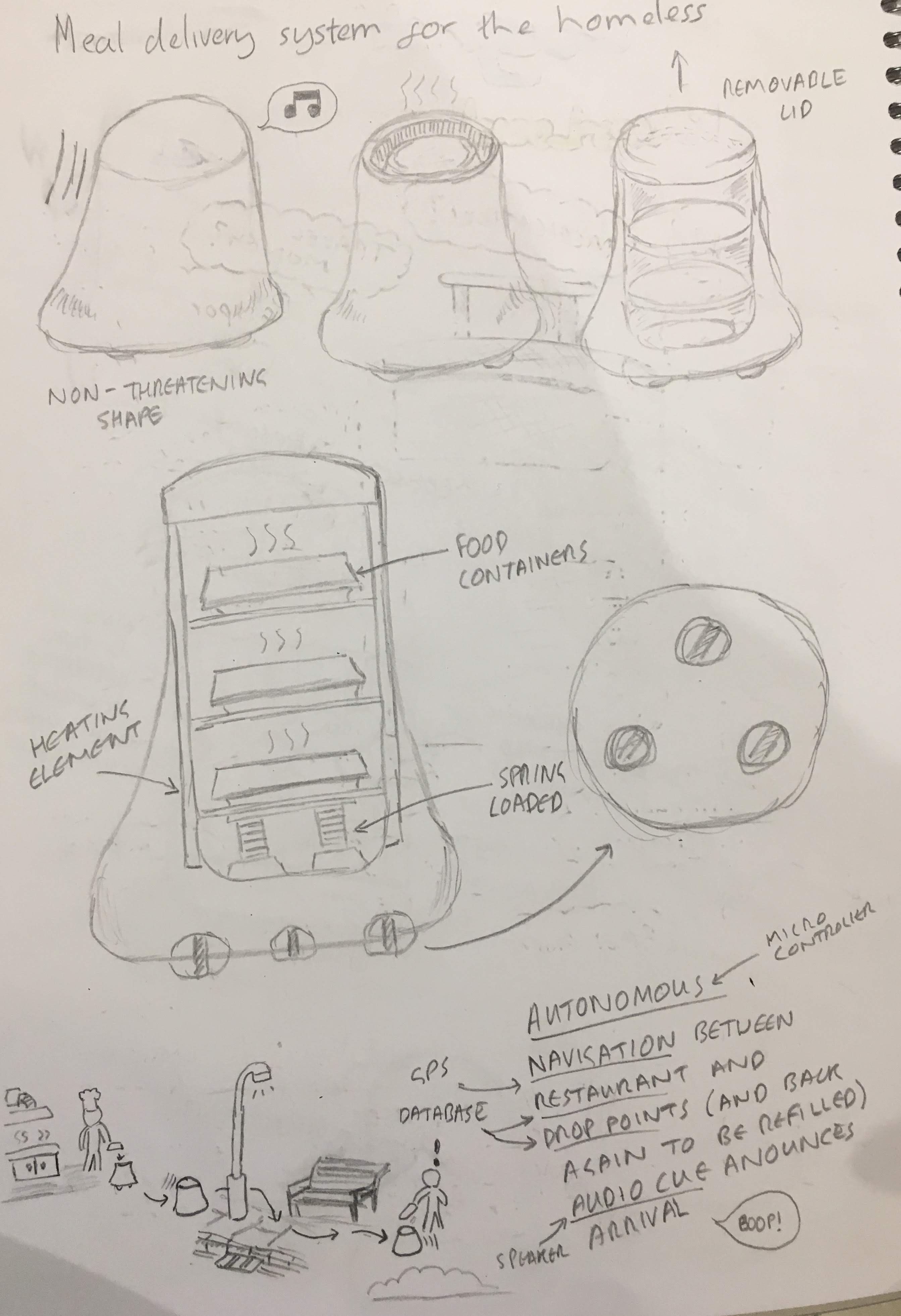 I envisioned autonomous luggage that would alert of disruption or assistance needed to encourage a sense of collective responsibility, and food delivery systems that would autonomously deliver hot meals to people living on the streets.